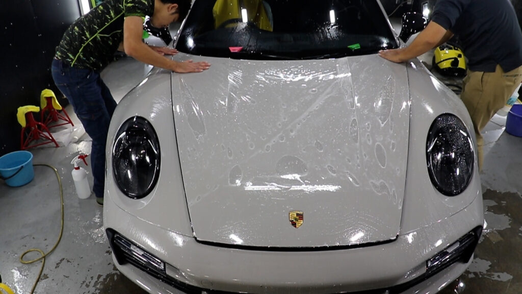 当店では、まずボディ全体の下地処理を行い、フロント周りなどにPPFを施工。その上から、「塗装部分」「フィルム部分」それぞれに適したコーティングを使い分けることが多いです。